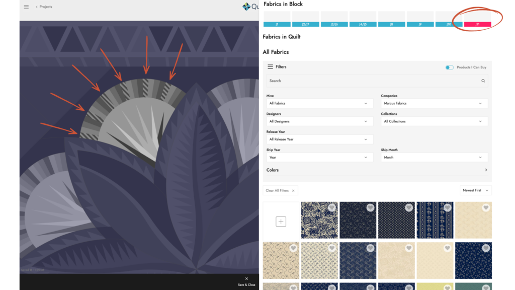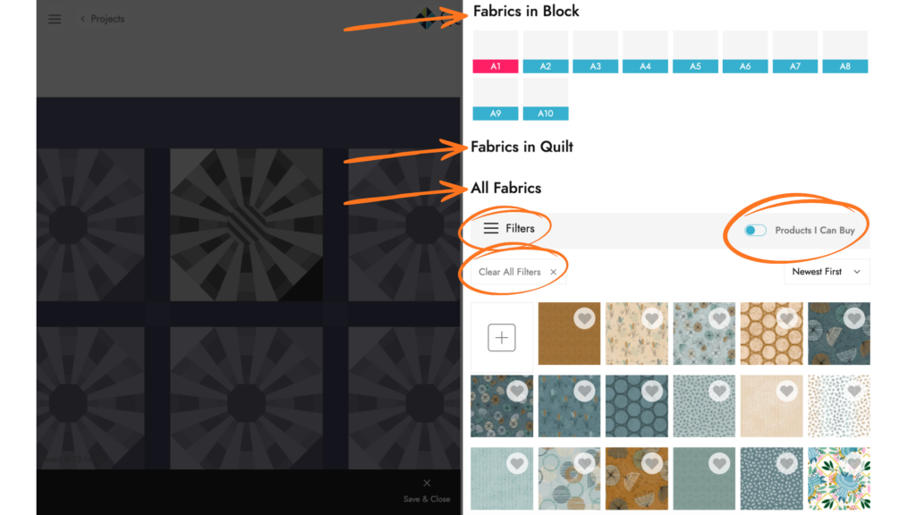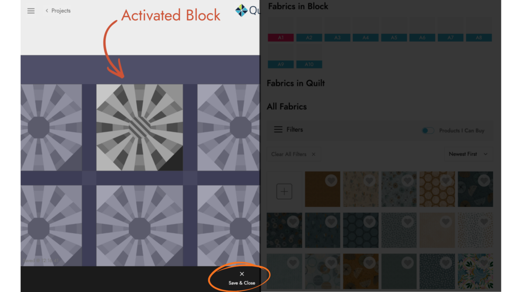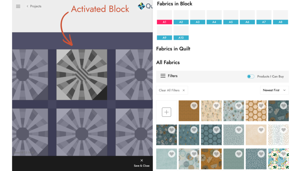 When you’re happy with your fabric choices for this block group: Click Close & Save