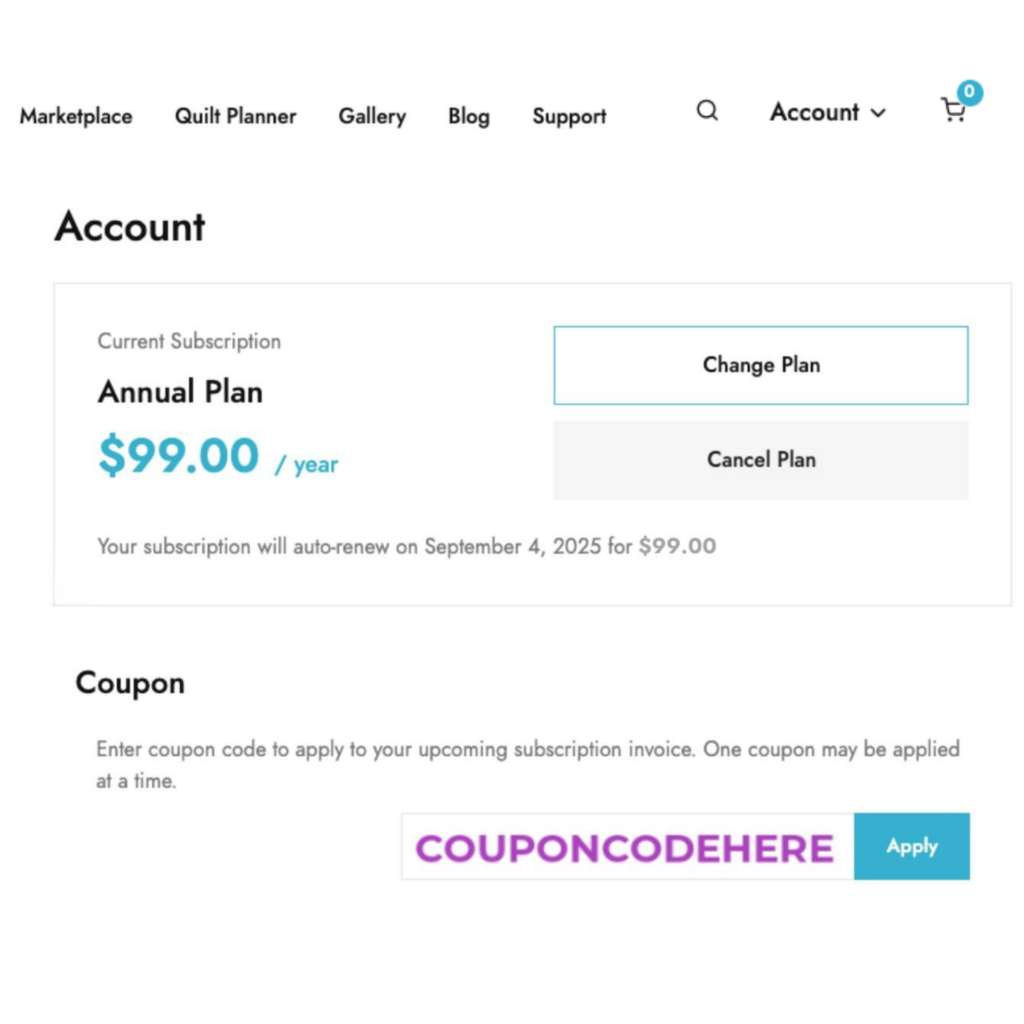 - If you already have a coupon code on your Account that is not a Quiltworx Box coupon, adding this one replaces the old one, and any unused time from the previous coupon is forfeited. Please contact customer service if you need help managing coupons.
