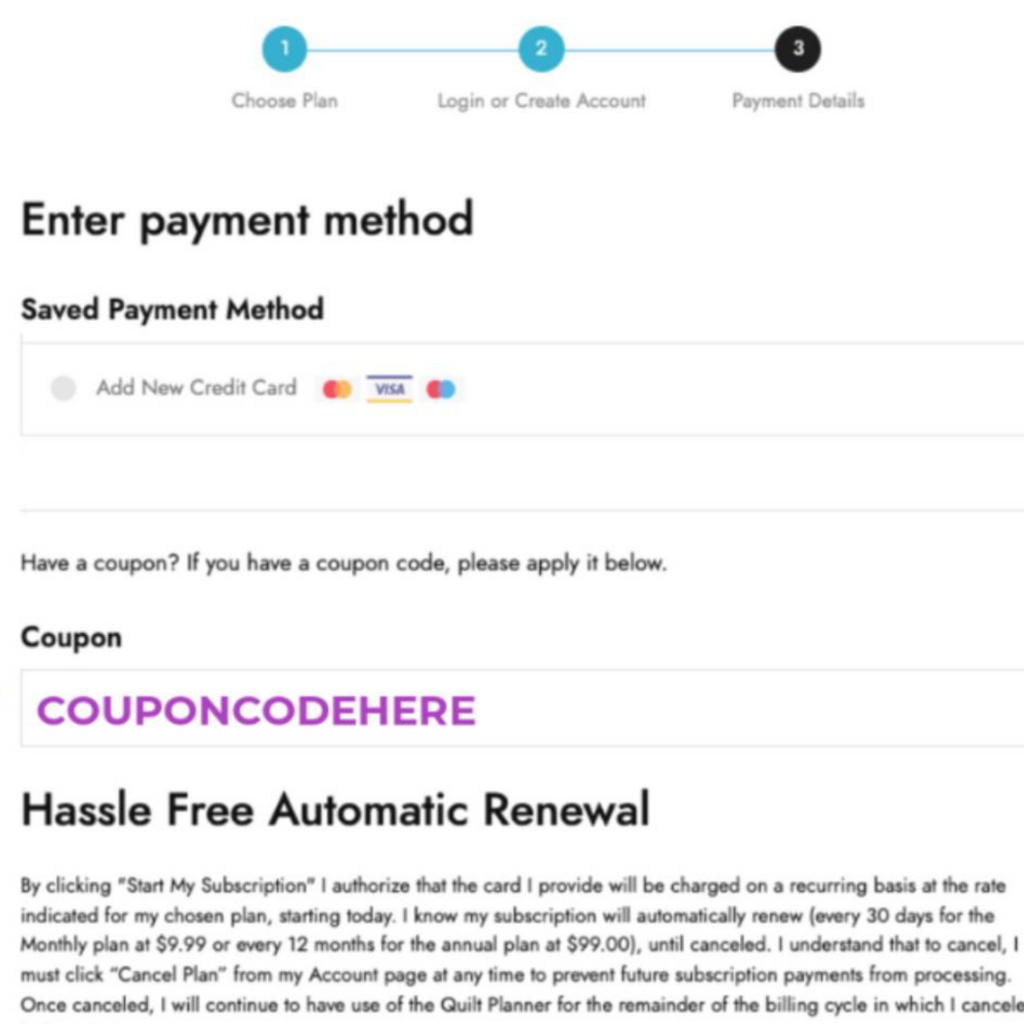 - Enter the Quiltworx Box coupon code in the “Coupon” field under Payment Details.