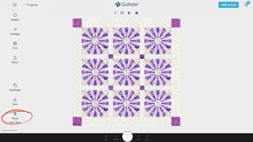 (You’ll see: Details, Yardage, Print, Share, Duplicate, Save, Auto-Save) - Wait for the timestamp to complete