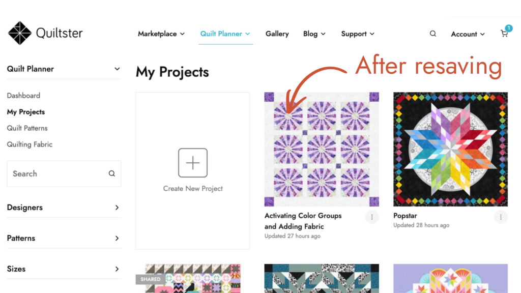 If you leave the main Quilt Planner page before the timestamp appears (for example, by going to your Dashboard, My Projects, or the Marketplace), your project will still save.