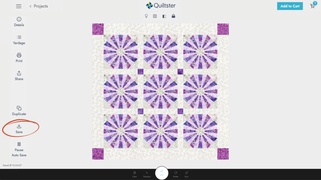 Even though your project automatically saves by default, you can click Save anytime as a backup before leaving. This button lives on the main Quilt Planner page.